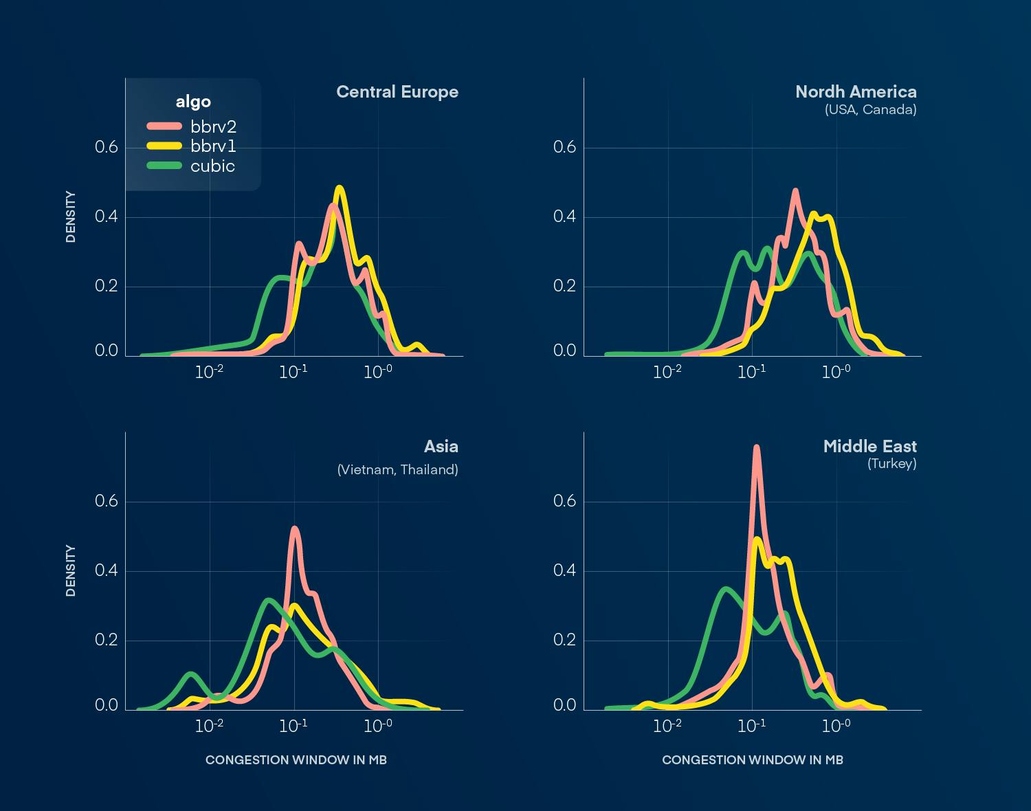 The key conclusion is that BBRv1 outperforms BBRv2 in Europe, North America, and the Middle East, even though BBRv2 should be superior to the previous version, where BBRv1 is able to achieve a higher congestion window size. On the other hand, BBRv2 works better in Asia, where it is able to achieve a more stable congestion window size compared to Cubic and BBRv1.
